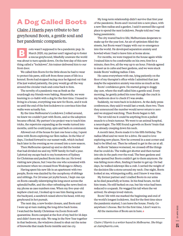 Writing | Articles Premier, I went to an Opus Dei school and experienced shame’s silencing power Dominic Perrottet said no one complained about the Opus Dei Sydney schools. But children don’t understand abuse until it is years too late. -Read more at Crikey "Men Are Like Dogs": What I Was Taught About Sexual Assault at My Catholic Private School We didn’t learn about alcohol and consent, because we didn’t learn about consent at all. We learned about sin and shame and how avoiding sexual assault was a female responsibility. -Read more at Guardian Australia I Worked For an Amish Reality TV Show The show represents the industry’s worst temptation to exploit characters and capitalize on their suffering. -Read more at Gen Magazine A Dog Called Boots Boots wasn’t supposed to be a pandemic pup. In March 2020, my partner and I signed up to foster a rescue greyhound, blissfully unaware the world was about to turn upside down. -Read more at The Big Issue